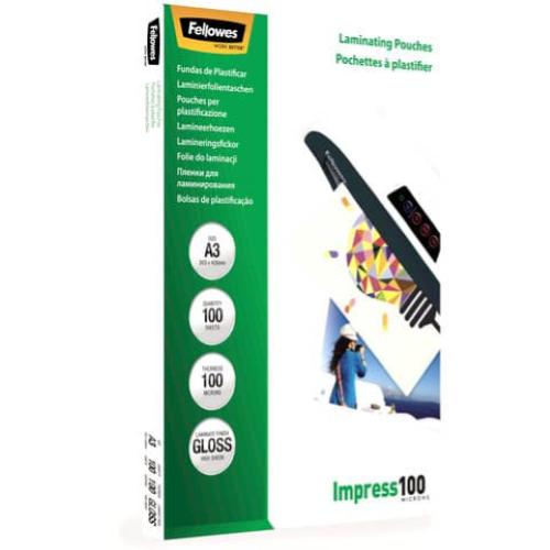 Fogli Plastificatrice Pouches Fellowes Standard Impress100 finitura lucida - 2x100 µm - A3 100pz
